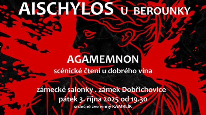 DOBŘICHOVICE – Agamemnon neboli scénické čtení první části jediné zachované antické trilogie Oresteia se uskuteční 3. října od 19:30 hodin na zámku v Dobřichovicích.