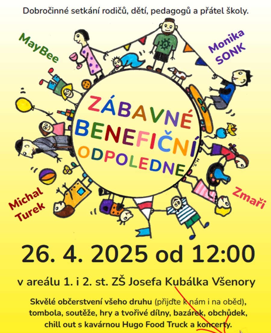 Další ročník Zábavného benefičního odpoledne můžete navštívit 26. dubna od 12 hodin v prostorách 1. a 2. stupně všenorské školy. Letos se můžete opět těšit na tombolu, tvořivé dílničky a mnoho lahodných dobrot včetně koncertů. Získané peněžní prostředky budou využity na další rozvoj školy a pomoc dětem, které ji potřebují.