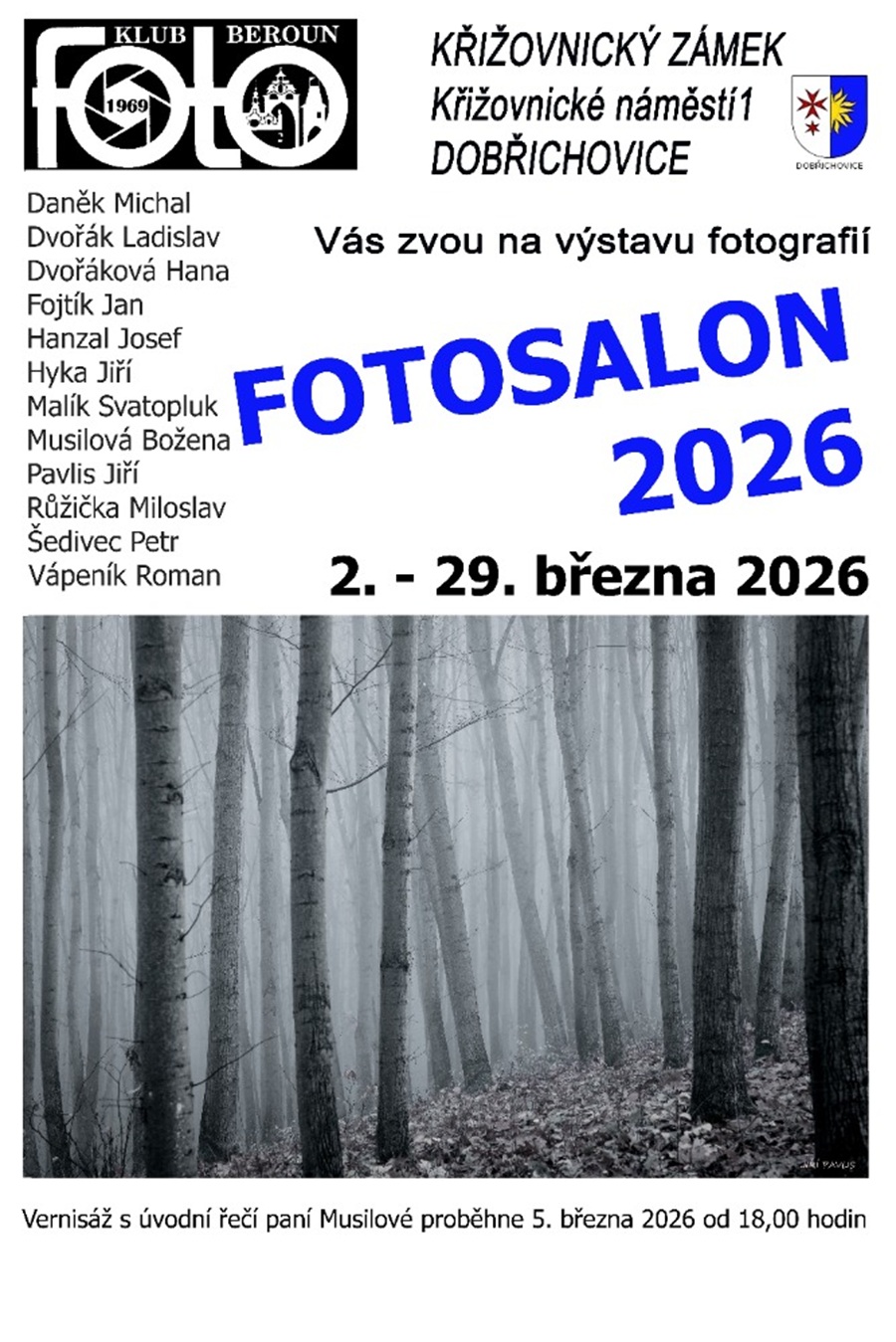 Fotoklub Beroun pořádá od 2. do 29. března na zámku v Dobřichovicích výstavu Fotosalon 2026. Vernisáž výstavy se koná 5. března od 18 hodin uvede členka Fotoklubu Beroun Božena Musilová.