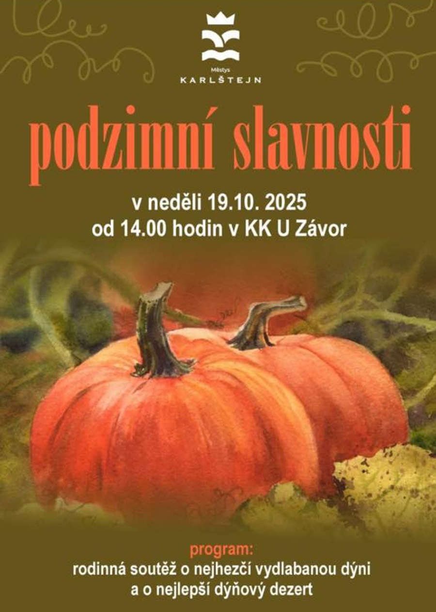 Rodinná soutěž o nejhezčí vydlabanou dýni a o nejlepší dýňový dezert se koná 19. října ve 14 hodin v KK U Závor v Karlštejně.