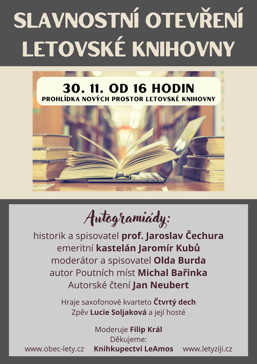 Otevření letovské knihovny proběhne 30. listopadu v 16 hodin v ZŠ LetMo. Při té příležitosti můžete vidět autogramiády spisovatelů Prof. J. Čechury, J. Kubů, M. Bařinky a O. Burdy, autorské čtení J. Neuberta, zazpívají a zahrají místní hudební uskupení, moderovat bude Filip Král.