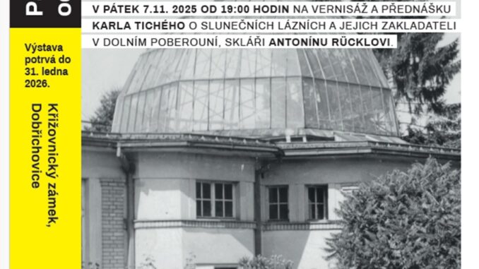 Pokud jste v létě nestihli zhlédnout černošickou výstavu o unikátních slunečních lázních, budete mít příležitost v listopadu u sousedů v Dobřichovicích. Právě tam se výstava nazvaná Rücklovy léčivé sluneční lázně přesune z nižborské sklárny, kde byla k vidění v říjnu. Výstava začne v pátek 7. listopadu v 19 hodin na zámku. Výstava bude na zámku k vidění až do konce ledna 2026.