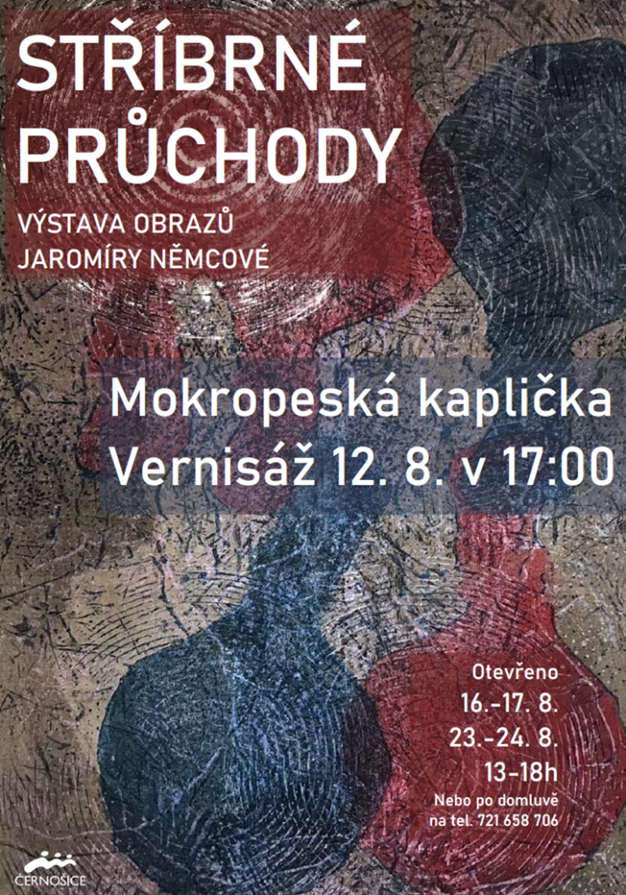Výstava v kapličce12. srpna 2025 od 17:00 hodinVýstava, Mokropsy, 30. 7. 2025 Lucie Hochmalová Sochařka Jaromíra Němcová sice pochází z Černošic, dosud v nich ale nikdy nepředstavila svou tvorbu. Až nyní chystá výstavu svých obrazů Stříbrné průchody. V Mokropeské kapličce bude zahájena vernisáží 12. srpna v 17 hodin.