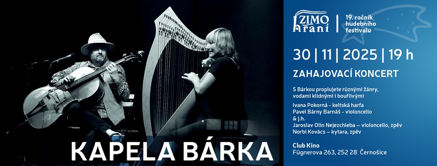 Poslední listopadový den v Černošicích startuje již 19. ročník festivalu Zimohraní. Festival zahájí na první adventní neděli, tedy 30. listopadu od 19 hodin kapela Bárka. Hosty budou Jaroslav Olin Nejezchleba (violoncello, zpěv) a Norbi Kovács (kyrtara).