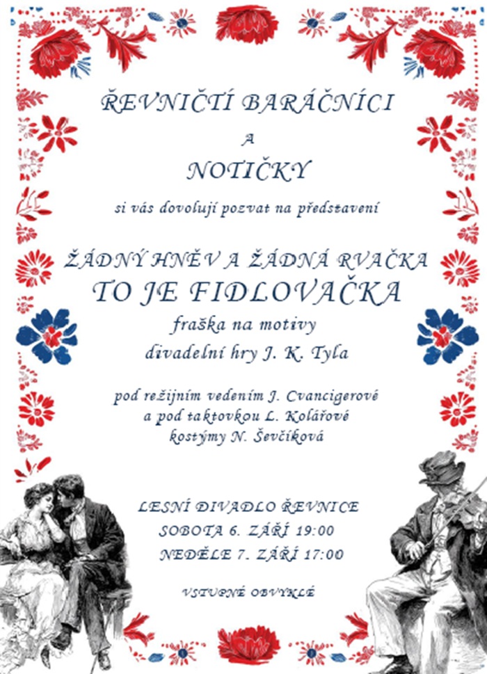 ŘEVNICE – Známou divadelní hru Žádný hněv a žádná rvačka, to je fidlovačka sehrají v září řevničtí Baráčníci a Notičky v Lesním divadle v Řevnicích. Hrát se bude 6. září od 19 hodin a 7. září v 17 hodin.