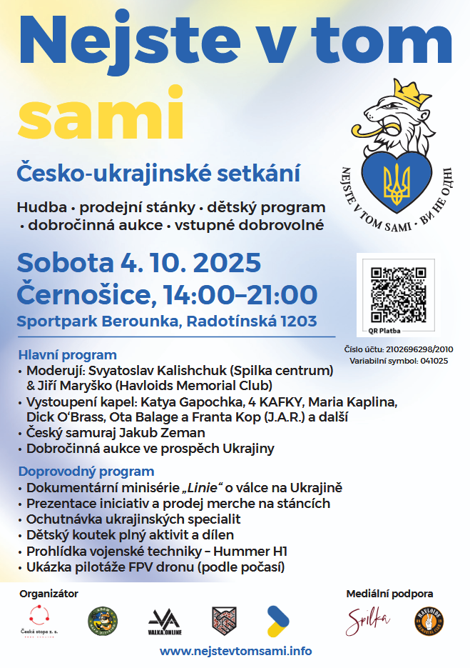 ČERNOŠICE – Pod názvem Nejste v tom sami se v sobotu 4. října odpoledne uskuteční v černošickém Sportparku Berounka česko-ukrajinské setkání na podporu Ukrajiny. Akce s bohatým programem potrvá od 14 do 21 hodin.