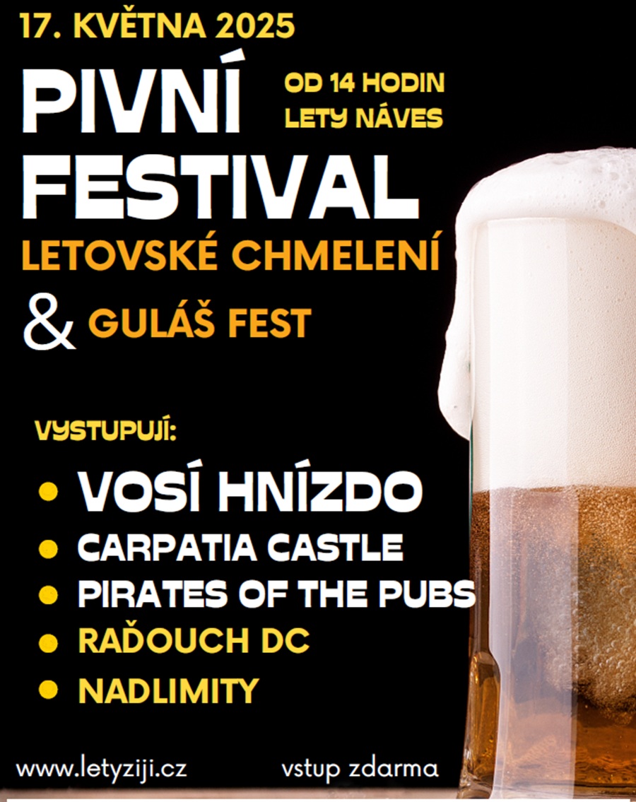 Letovské chmelení s kapelou Vosí hnízdo zažijete 17. května od 14 hodin na návsi. Prověříte skvělé pivovary z okolí: Horymír, Řeporyje, Všerad, Malý Janek, Kulivá hora a samozřejmě místní MMX. Tentokrát akci doplní Gulášfest i pivní soutěže o zajímavé ceny. Hudební doprovod zajistí rockové kapely Vosí hnízdo, Carpatia Castle, Pirates of the Pubs, Raďouch DC a Nadlimity.