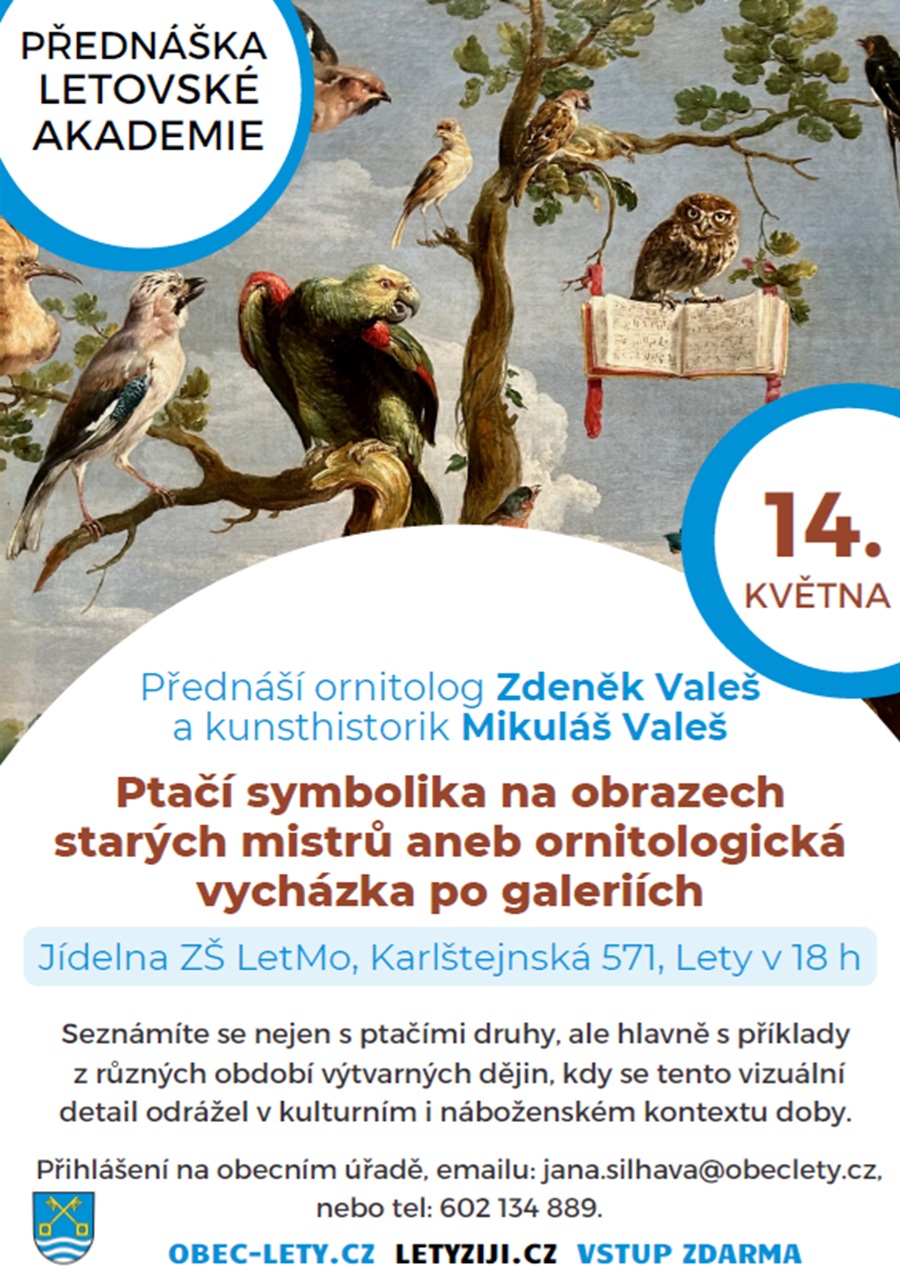 LETY – Ptačí symboliku na obrazech starých mistrů vysvětlí 14. května od 18 hodin ornitolog Zdeňěk Valeš a kunsthistorik Mikuláš Valeš, a to ve školní jídelně ZŠ LetMo.