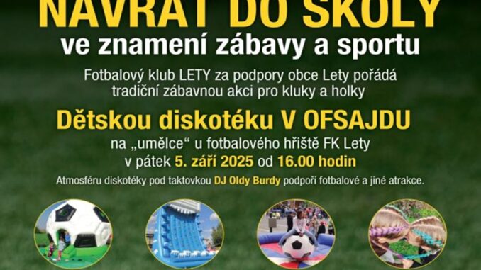 Program v Letech začne v 16 hodin na umělce u fotbalového hřiště FK Lety. Vydovádět se budou moci děti také na skákacím hradě, elektrickém rodeu či nafukovací lezecké stěně. Pro holky je tu novinka v podobě zaplétání copánků. Pro všechny jsou připraveny mlsavé ceny. Vstup je zdarma.