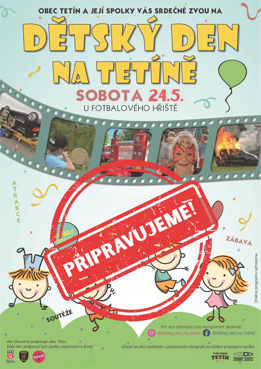 TETÍN – Dětský den na Tetíně se bude slavit 24. května od 12 hodin u místního fotbalového hřiště. Slavnost pořádá obec Tetín a její spolky.