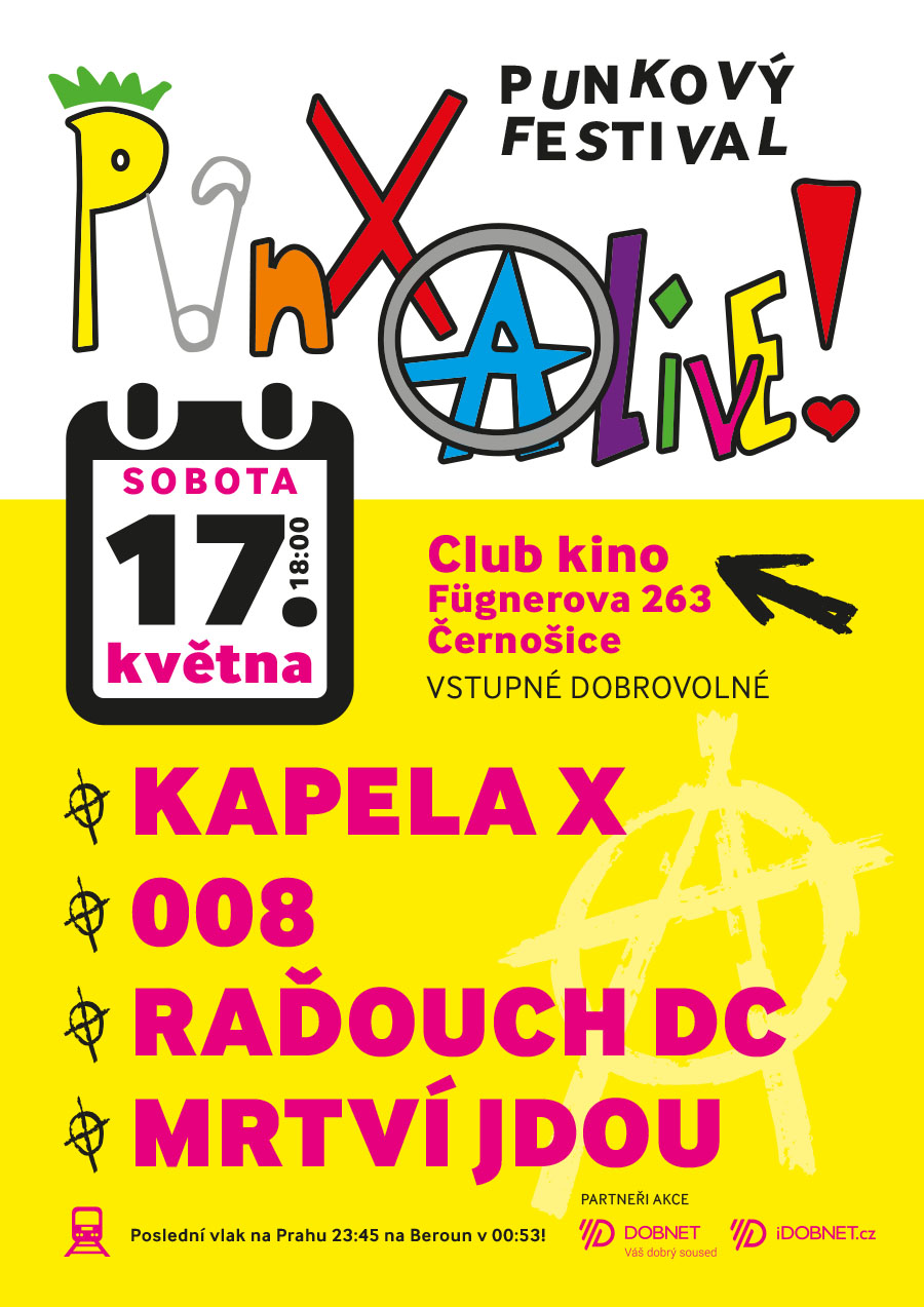 ČERNOŠICE – Chyběla vám v regionu punková akce, na kterou můžete přijít v martenskách, se sichrhajckou v uchu a s barevným čírem? Nám tedy určitě, a proto vám představujeme PunX Alive! Nultý ročník festivalu se koná 17. května od 18 hodin v černošickém Club Kině.