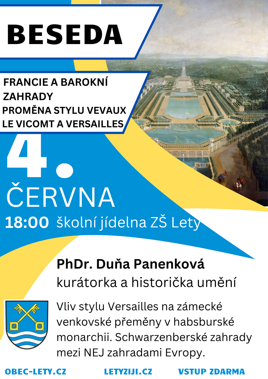 LETY – Přednáška kurátorky a historičky umění PhDr. Duni Panenkové s názvem Francie a barokní zahrady: proměna stylu ve Vaux le Vicomt a Versailles se bude konat 4. června od 18 hodin v jídelně ZŠ Lety. Přednášku pořádá Letovská akademie.