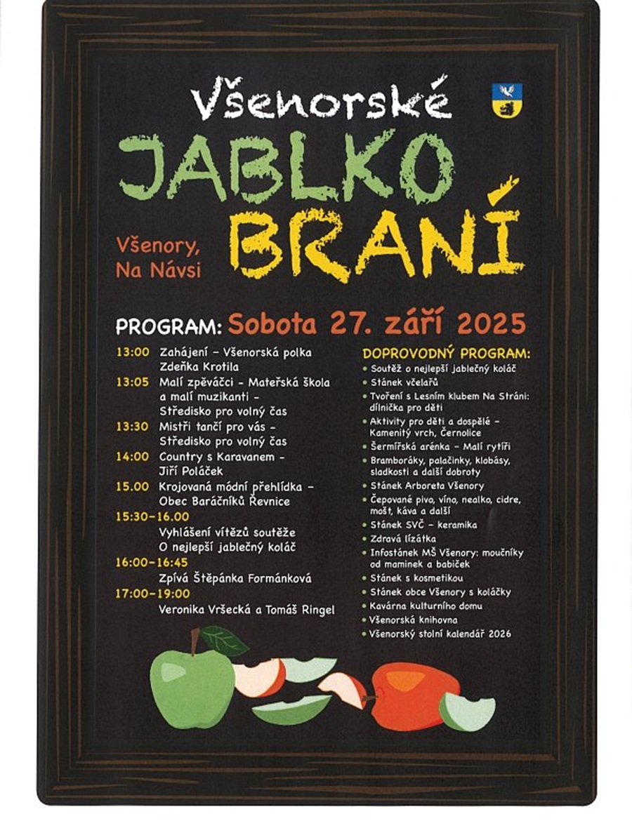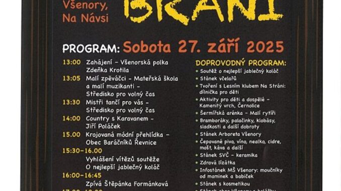 VŠENORY – Tradiční všenorská akce Jablkobraní propukne 27. září od 13 hodin na návsi ve Všenorech. Tradičně bohatý program zahrnuje hudební a taneční vystoupení, soutěž o nejlepší jablečný koláč a hudba k poslechu i tanci.