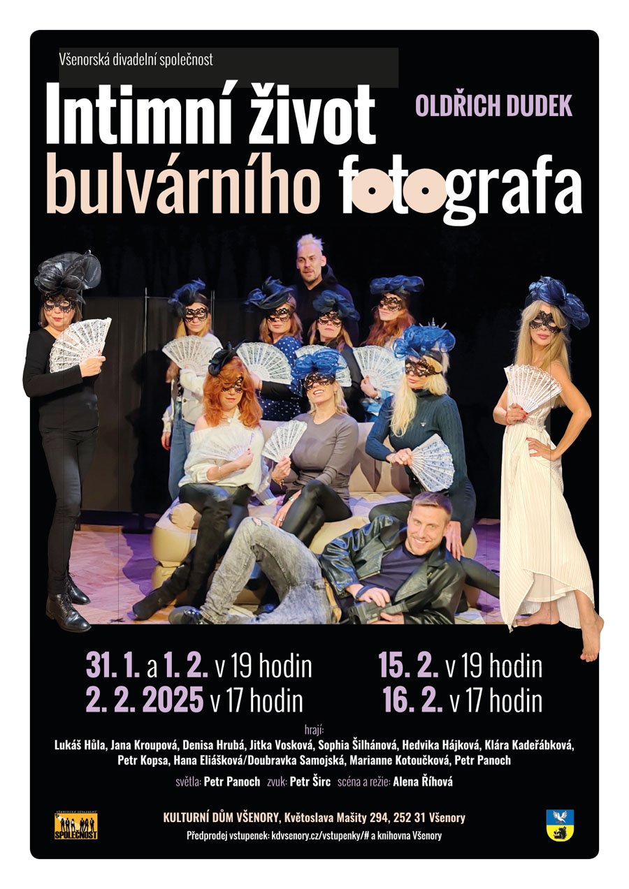 VŠENORY – Další dvě představení divadelní hry Intimní život bulvárního fotografa chystá Všenorská divadelní společnost na 15. února v 19 hodin a 16. února v 17 hodin. Komedii můžete vidět v Kulturním domě Všenory.