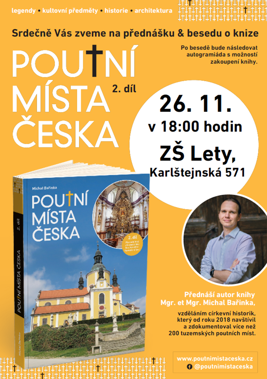 LETY – Beseda Letovské akademie se bude konat 26. listopadu v 18 hodin ve školní jídelně ZŠ LetMo. Přednášet bude autor knihy Poutní místa Česka Michal Bařinka, vzděláním církevní historik, který od roku 2018 navštívil a zdokumentoval více než 200 tuzemských poutních míst.