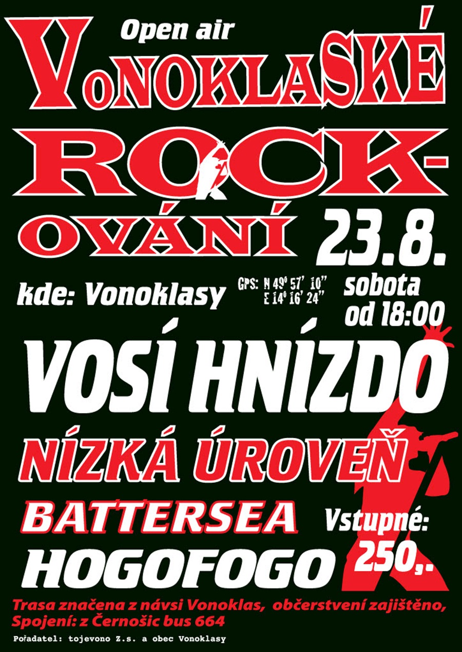 Během večera zahrají kapely Hogo Fogo, Buttersea, Vosí hnízdo a Nízká úroveň. Trasa bude značena z návsi ve Vonoklasech až k místu konání, občerstvení je zajištěno.