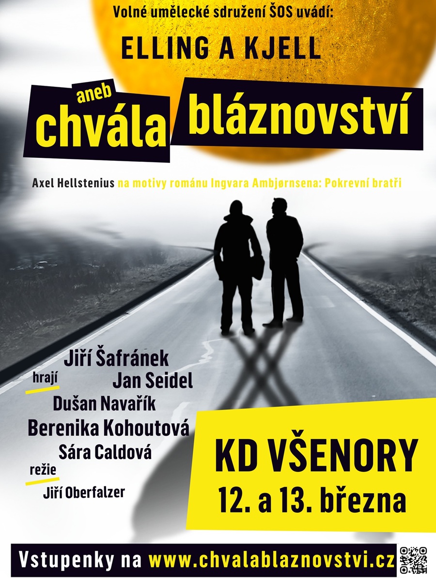 VŠENORY – S reprízou norské hry Ellin a Kjell Bjarne aneb Chvála bláznovství se ve všenorském Kulturním domě představí tvůrčí skupina ŠOS pod taktovkou režiséra a místopředsedy Senátu Jiřího Oberfalzera. Laskavou komedii uvidíte 12. a 13. března od 19:30 hodin.