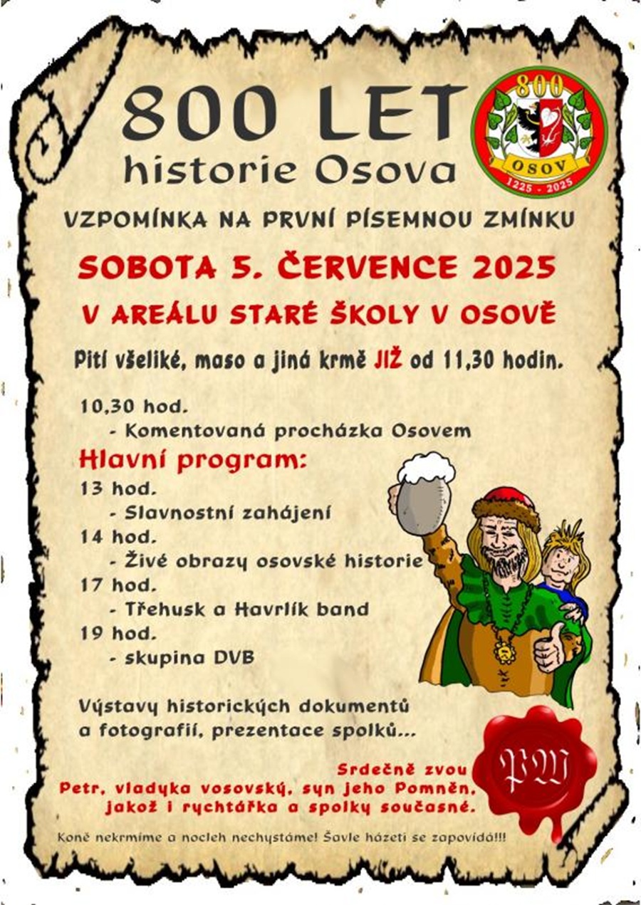 OSOV – Obec Osov oslaví 5. července kulaté výročí – 800 let od svého vzniku. Vzpomínka na první písemnou zmínku se odehraje v areálu staré školy v Osově.