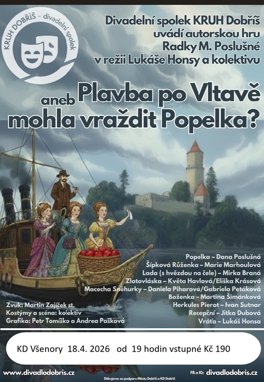 Plavba po Vltavě se spojí s Popelkou 2. 4. 2026 Lucie Hochmalová Kultura VŠENORY – Plavba po Vltavě aneb Mohla vraždit Popelka? To je název divadelní hry, kterou uvede divadelní spolek KRUH Dobříš 18. dubna od 19 hodin v Kulturním domě Všenory.