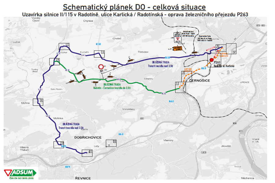 Objízdná trasa bude vedena z Radotína Zderavskou ulicí, po silnici II/101 přes Třebotov, dále po III/10120 přes Kuchařík do Kuchaře a po III/10122, III/11621 a II/116 do Letů na silnici II/115 přes Dobřichovice do Černošic (obousměrně).