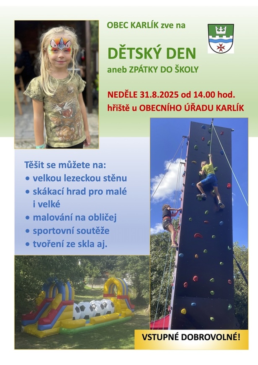 KARLÍK – Oslavy dne dětí se budou konat 31. srpna u hřiště v Karlíku. Od 14 hodin tu děti i jejich rodiče zažijí mnoho zábavy.