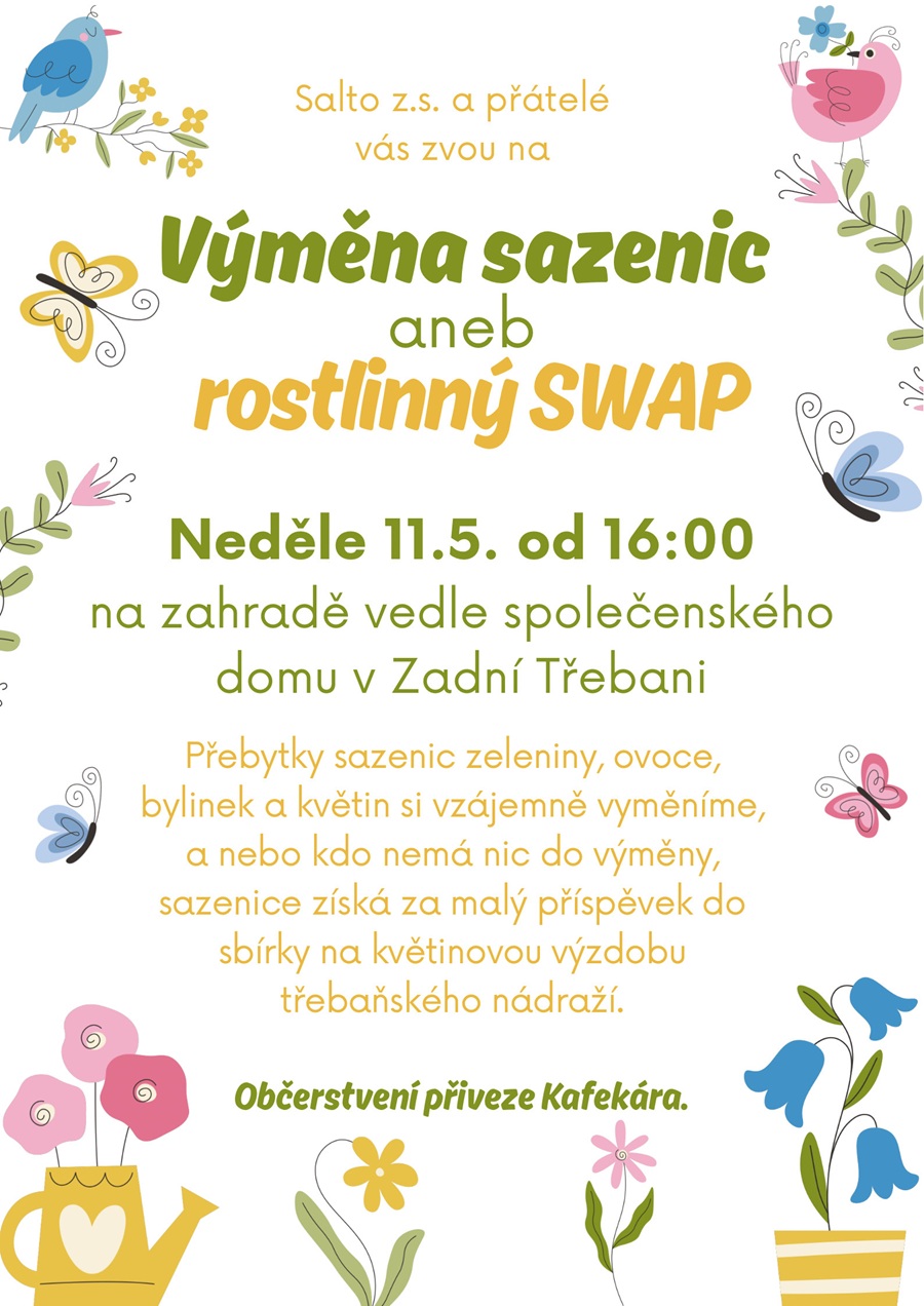ZADNÍ TŘEBAŇ – Spolek Salto z. s. a přátelé zvou zájemce na výměnu sazenic. Rostlinný swap se koná 11. května od 16 hodin v zahradě u Společenského domu.