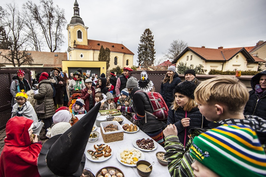 Menší účastníci průvodu si mohou obchůzku zkrátit a na 15. hodinu vyrazit do Dřeváku, kde pro ně Divadlo 100 opic sehraje loutkovou Zimní pohádku. U kamen tam mohou počkat na finální příchod maškar.