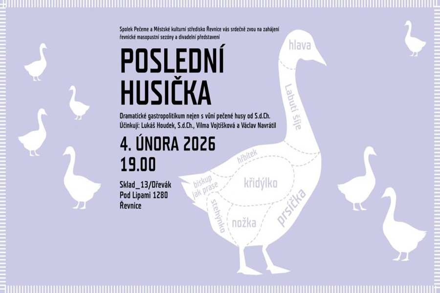 Dramatické gastropolitikum nejen s vůní pečené husy nazvané Poslední husička sehrají 4. února od 19 hodin v Dřeváku Lukáš Houdek, S. d. Ch., Vilma Vojtíšková a Václav Navrátil. Vstupenku je možné zakoupit přes portál darujme.cz. „Chceme, aby naše město rozkvetlo smíchem a sousedskou pospolitostí. Díky vaší podpoře vdechneme život maskám z proutí, kůry či mechu, ve kterých se každý stane králem rejdiště! Přizveme říznou kapelu, která nikoho nenechá stát v koutě, osedláme koňský povoz pro unavené nohy maškar. Už se nám podařilo sehnat prostor, bandu nadšenců a přijede i divadlo!“ zvou pořadatelé. Každou korunu, kterou darujete, bude moci Nadace Via zdvojnásobit až do výše 20 000 Kč!